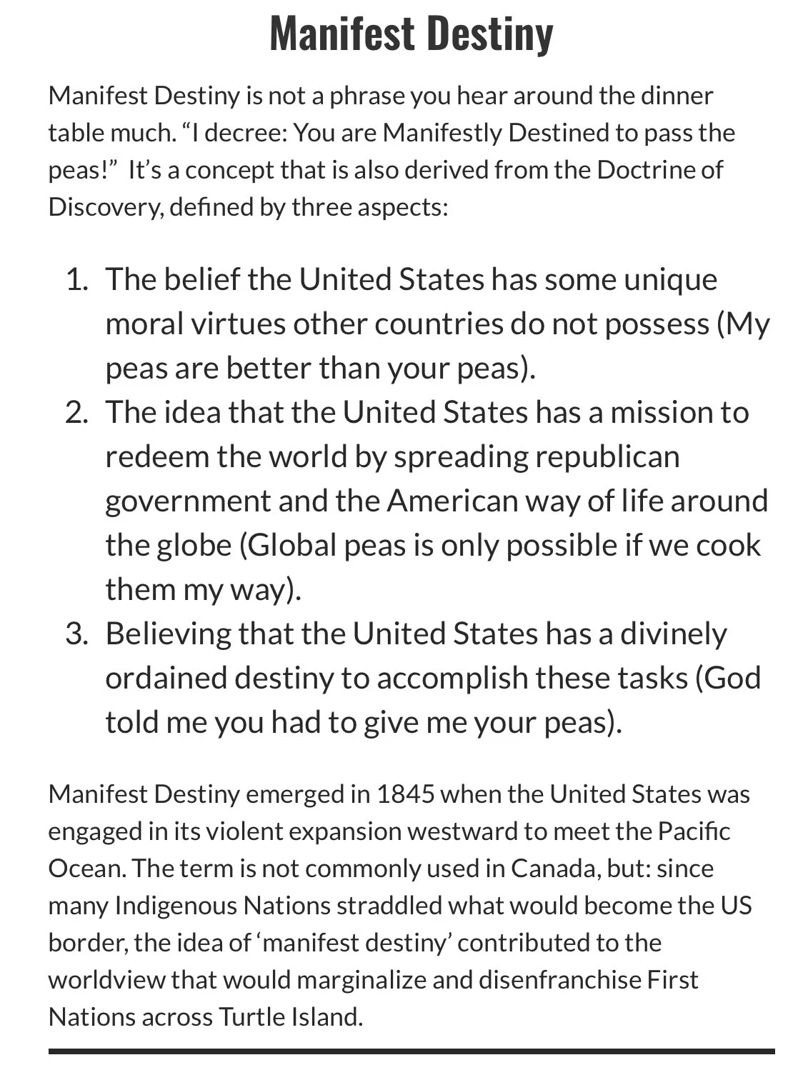 MANIFEST DESTINY: According to Kahn Academy, Manifest Destiny was “…the idea that white Americans were divinely ordained to settle the entire continent of North America. The ideology of Manifest Destiny inspired a variety of measures designed to remove or destroy the native population.” According to Wikipedia, “Manifest destiny was a phrase that represented the belief in the 19th-century United States that American settlers were destined to expand westward across North America, and that this belief was both obvious ("manifest") and certain ("destiny"). The belief was rooted in American exceptionalism and Romantic nationalism, implying the inevitable spread of the Republican form of governance. It was one of the earliest expressions of American imperialism in the United States of America.” The course website notes how MANIFEST DESTINY IS THE DOCTRINE OR BELIEF THAT THE EXPANSION OF SETTLER COLONIALISM THROUGHOUT THE AMERICAN CONTINENTS WAS BOTH JUSTIFIED AND INEVITABLE. The course website described it as follows: